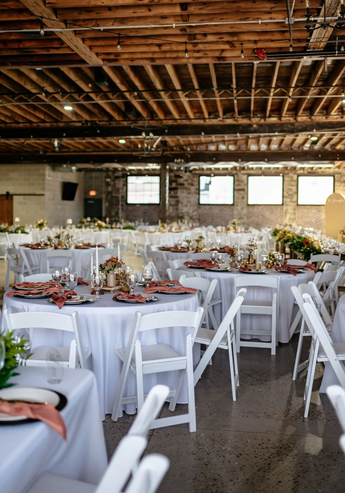 Our large event space has a capacity of 300 with tables and chairs, which are included with your rental of the large space, and 600 without tables. With your choice of cocktail, farmhouse, round, or rectangle tables. Bring your event to life with onsight decor rental from Something Borrowed.
